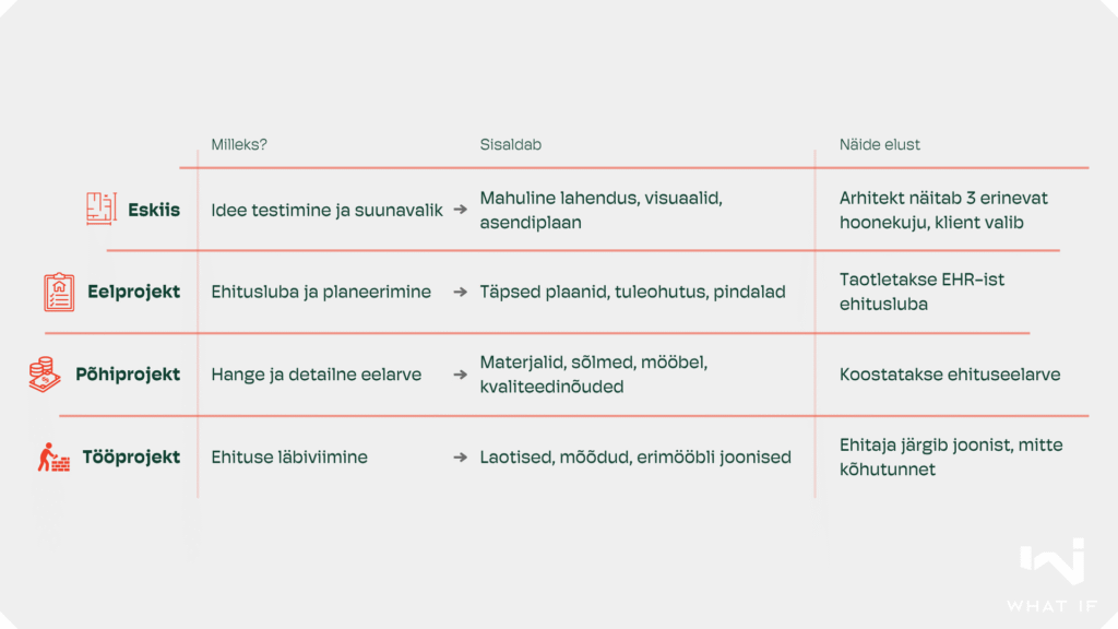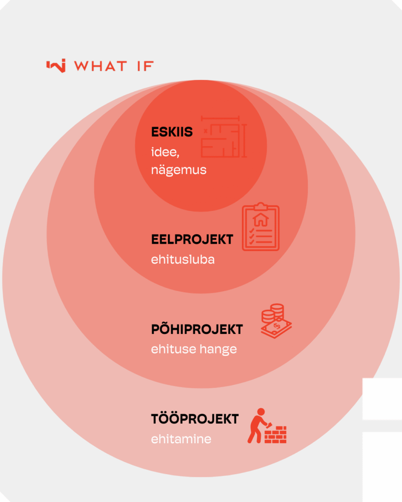 Eskiisist saab idee, eelprojektist luba, põhiprojektist kindlus ja tööprojektist teostus.
